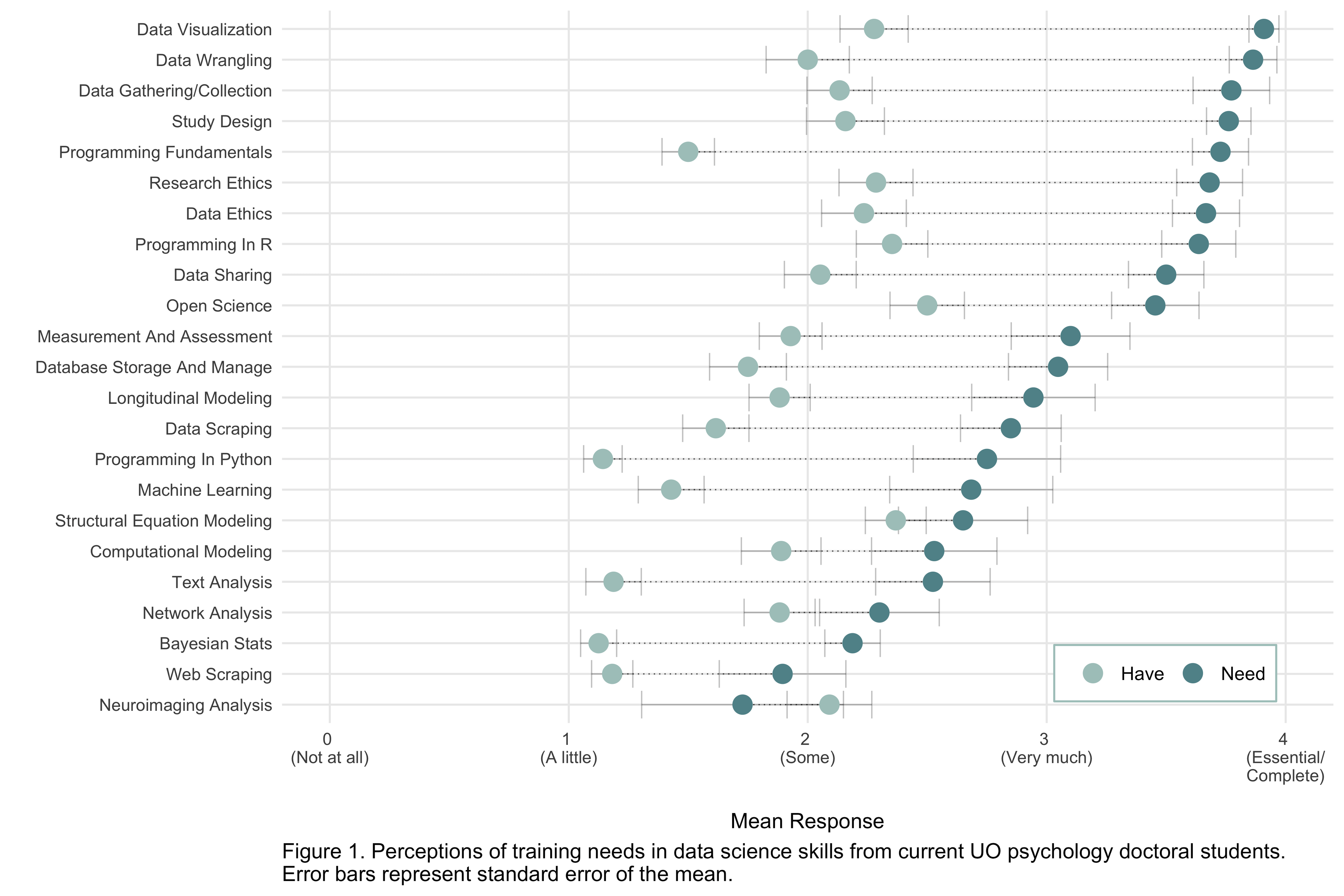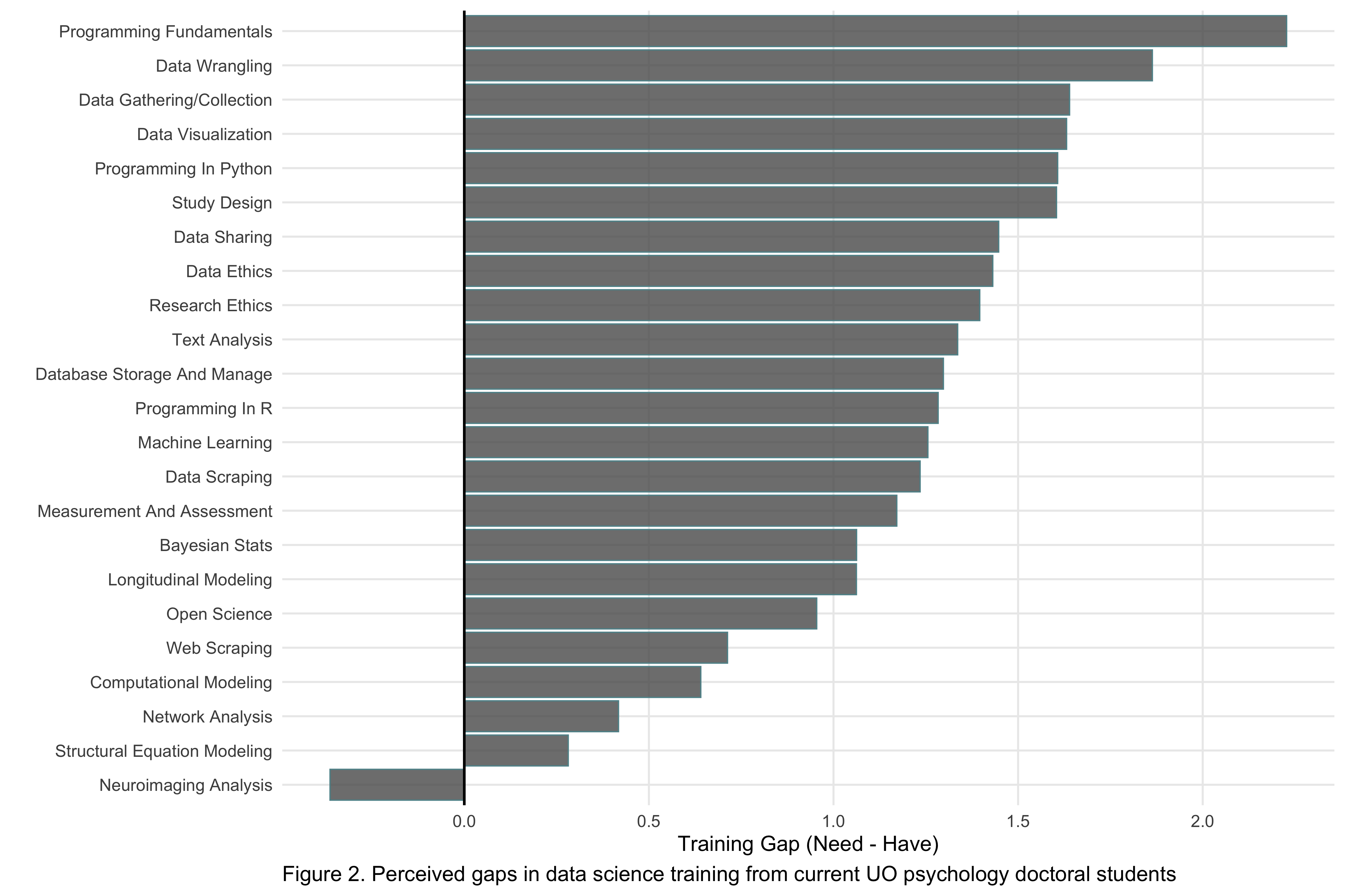 On the whole, it seems that that there are bigger training gaps for more general data science skills (e.g., programming in R and Python, data wrangling, data visualization). In contrast, the smallest gaps exist for more specialized skills like advanced statistics (e.g., computational modeling, network analysis, structural equation modeling) – likely because our department has an entire class devoted to each of these topics.